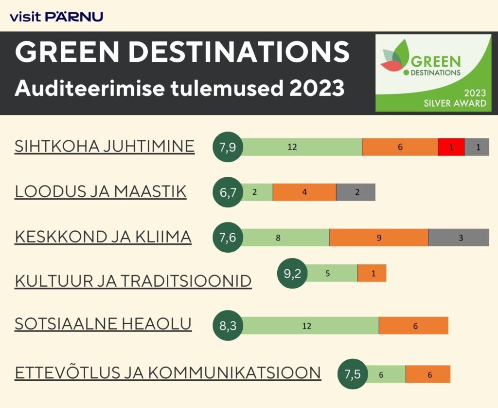 Pärnu liitus Green Destinations programmiga Eesti esimesel pilootaastal linnana. Peale esimest auditeerimist saavutati pronkstase. Järgmisel auditeerimisel laiendati programmi üle sihtkohta, kaasates kogu Pärnumaad. Pärnumaa viimane auditeerimine toimus 2023. aastal, mille tulemusena tõusime pronkstasemelt hõbetasemele!