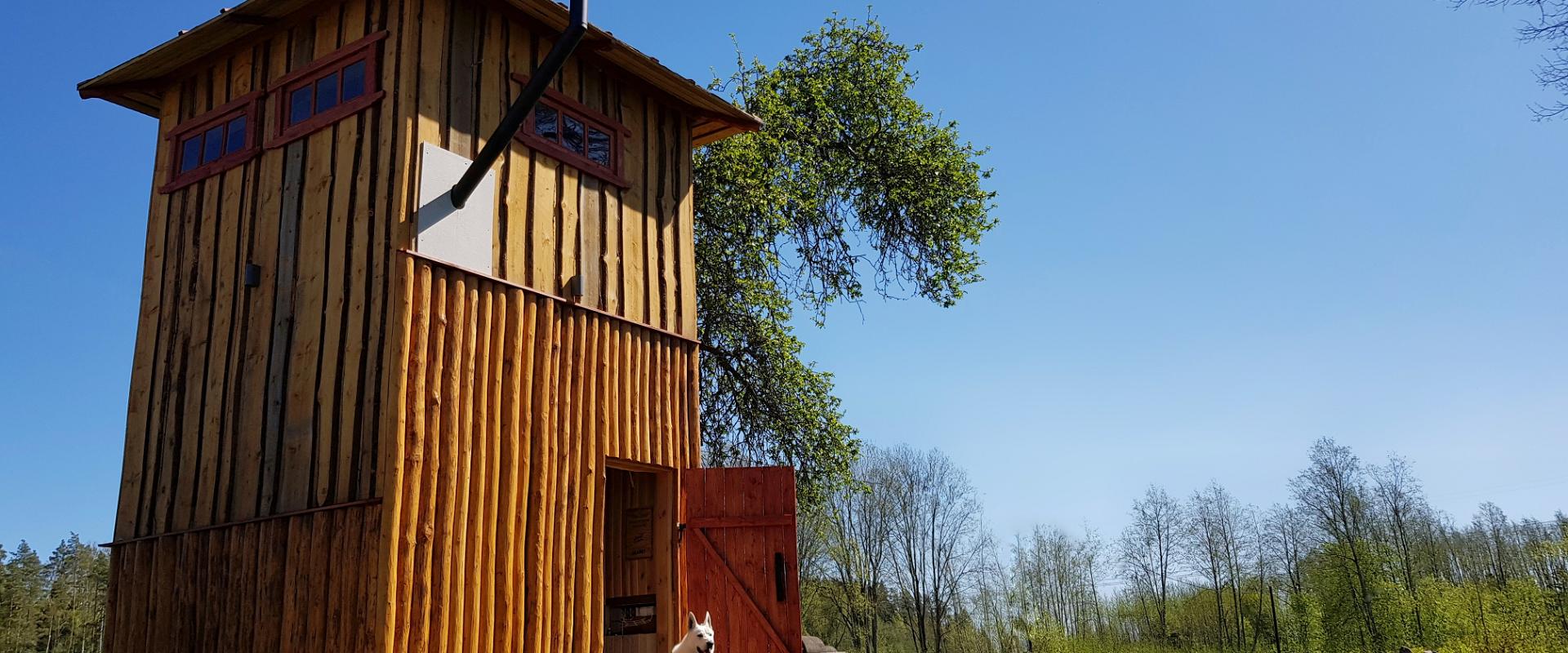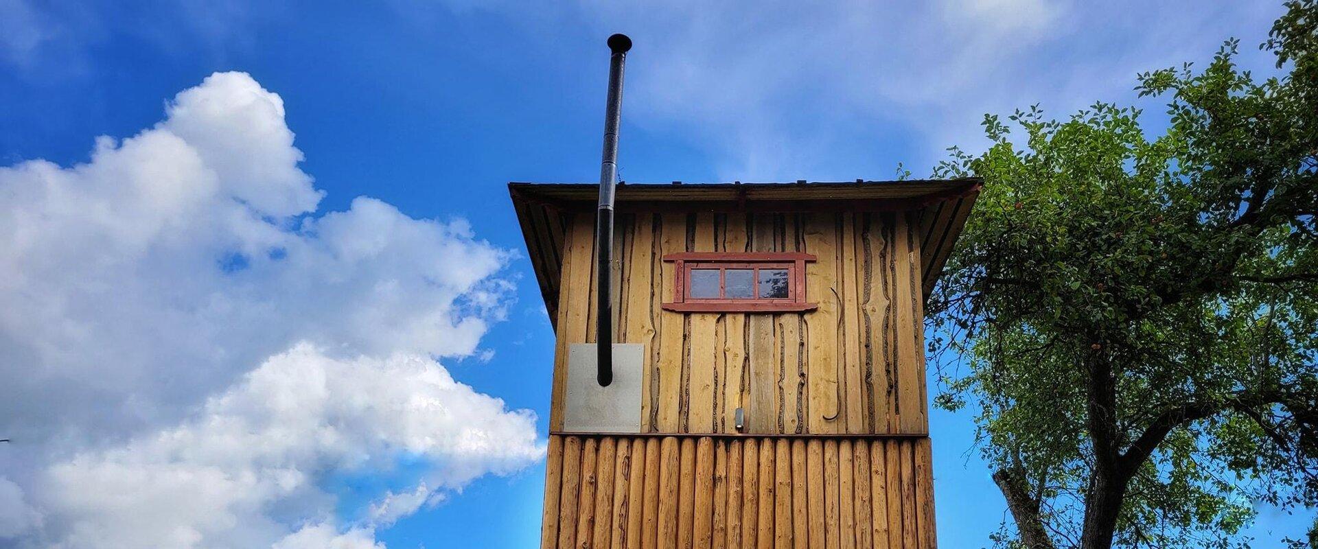 Pilnīgi atšķirīga pirts pieredze plašā divstāvu torņa formas pirtī!Pirts iekuršana ir patīkami laikietilpīga, tādējādi padarot gala rezultātu ļoti baudāmu. Pirtī divos stāvos var uzturēties līdz 15 cilvēki, un tornī ir arī mazgāšanās iespēja.