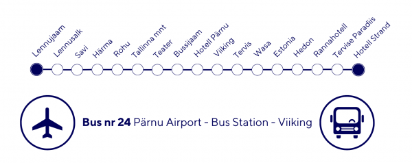 Автобусная остановка аэропорта находится перед пассажирским терминалом. Автобус номер 24 обслуживает маршрут Аэропорт – Пярнуский автобусный вокзал. Расписание меняется в соответствии с расписанием авиарейсов. Билет при покупке у водителя автобуса стоит 3 евро.