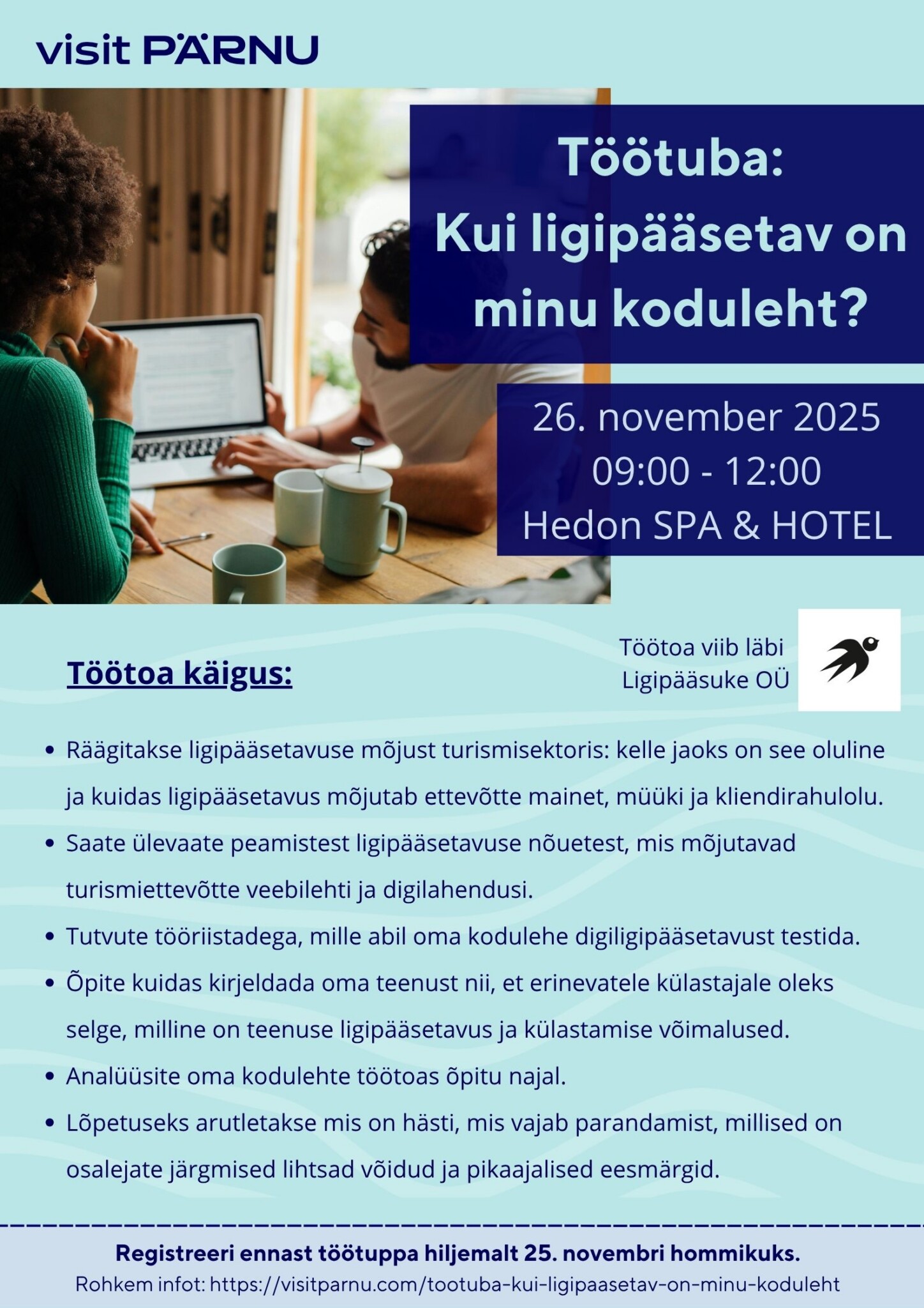 Töötoa eesmärk on aidata turismiettevõtjatel hinnata ja täiustada oma kodulehtede ligipääsetavust nii tehnilisest kui ka turunduslikust küljest. Osalejad saavad teadmisi, tööriistu ja oskusi, et oma kodulehtede ligipääsetavust hinnata, tuvastada kitsaskohti, tellida keerulisemaid tehnilisi parandusi, ning rakendada väiksemaid parandusi kohe koolituse järgselt. Samuti õpitakse, kuidas jõuda laiema sihtgrupini läbi ligipääsetava turunduse ja kommunikatsiooni nii veebis, kui sotsiaalmeedias.